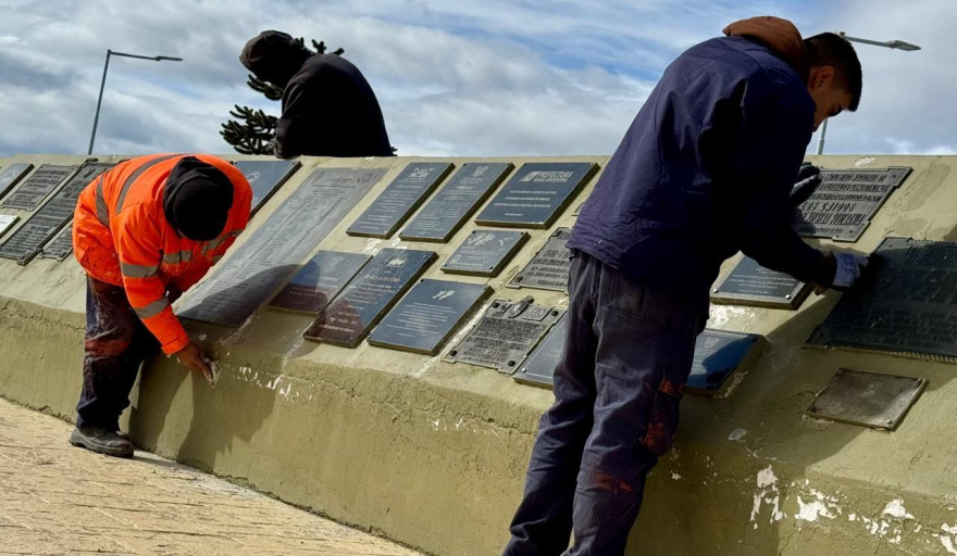 Personal de la Municipalidad de Ushuaia lleva adelante trabajos de restauración y mantenimiento en la Plaza Malvinas, uno de los espacios públicos más visitados de la ciudad tanto por vecinos como por turistas.