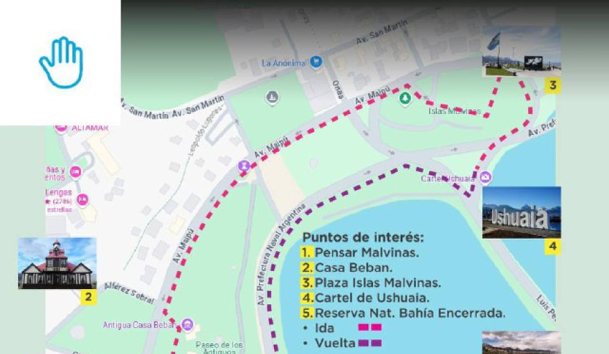 El recorrido continuará hasta la Plaza Islas Malvinas para conocer su historia y los elementos que la componen, y la propuesta concluirá junto al cartel de Ushuaia con una parada en ese lugar para realizar fotografías.