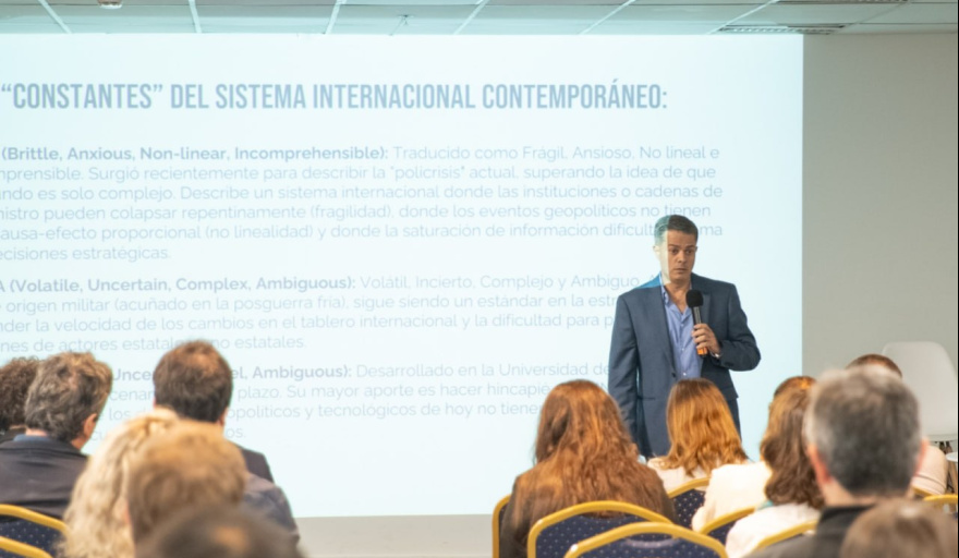 Durante su intervención, Dachary analizó el rol del Atlántico Sur en el escenario internacional contemporáneo, haciendo especial énfasis en la creciente competencia estratégica global.