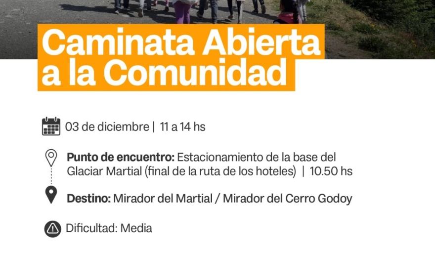 La misma se realizará este sábado 3 de diciembre de 11 a 14 horas. El punto de encuentro será en la base de la pista de esquí del Glaciar Martial (final de la ruta de los hoteles) a las 10:50 horas, finalizando a las 14 horas en el mismo punto.
