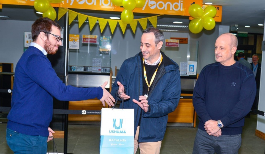 La Municipalidad de Ushuaia a través de la Secretaría de Turismo dejó inaugurada la nueva ruta de Flybondi Ushuaia- Calafate junto a autoridades de la línea aérea. En nombre de la ciudad, el coordinador de Asuntos Internaciones de la Secretaría de Turismo Carlos Henninger entregó presentes al gerente comercial de Flybondi Javier Soto y al Coordinador de Asuntos públicos Andrés Rojas.