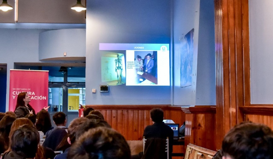 La propuesta, que contó con la presencia de 60 alumnos, alumnas y docentes, estuvo a cargo de la subsecretaria de Cultura y perteneciente además al pueblo Selk'nam Vanina Ojeda, quién presentó a las y los asistentes material audiovisual y relatos sobre la historia viva de quienes habitan nuestra isla desde hace más de 13 mil años.