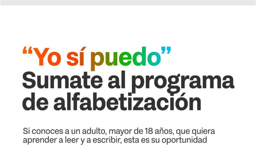 EL Gobierno de la Provincia, a través del Ministerio de Educación, lleva adelante el Programa de Alfabetización “Yo, sí puedo”, un método de alfabetización para adultos mayores de 18 años, para que aprendan a leer y escribir de manera fluida y así garantizar mayores oportunidades de acceso al mundo social y del trabajo.