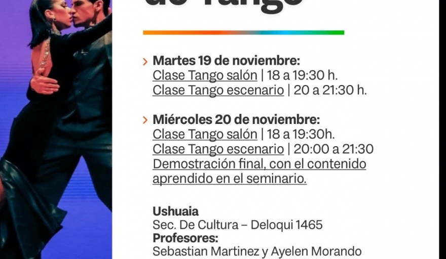 En Ushuaia será los días martes 19 y miércoles 20 de noviembre, en las instalaciones de la Secretaría de Cultura, ubicada en Deloqui 1465. La clase de Tango de Salón en el horario 18 a 19:30 h. y la de Tango de Escenario de 20 a 21:30 h.