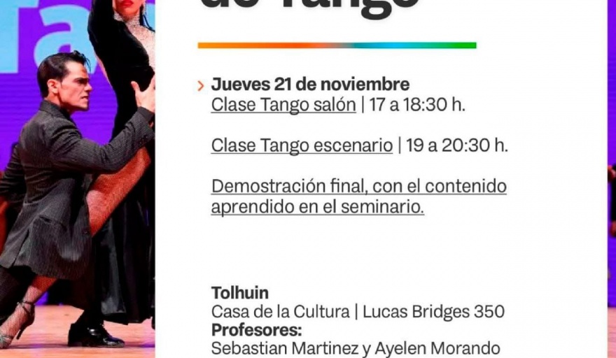 En la localidad de Tolhuin, el Seminario de Tango se desarrollará el día jueves 21 de noviembre en la Casa de la Cultura, sita en Lucas Bridge 350, en el horario de 17 a 18:30 h. la Clase de Tango de Salón, y de 19 a 20:30 h. la Clase de Tango de Escenario.