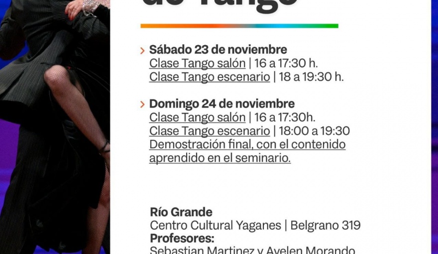 Finalmente, los días sábado 23 y domingo 24 de noviembre se hará lo propio en la ciudad de Río Grande, específicamente en el Centro Cultural Yaganes, ubicado en Belgrano 319. La Clase de Tango de Salón será de 16 a 17:30 h., mientras que la de Escenario será de 18 a 19:30 h.