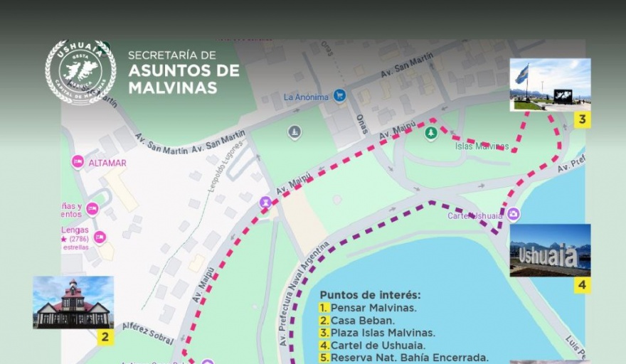 La Municipalidad de Ushuaia, a través de la Secretaría de Asuntos de Malvinas, invita a la comunidad a participar en un recorrido a pie por la ciudad, con el objetivo de reflexionar sobre la historia y la importancia de nuestras Islas Malvinas. Para participar en el recorrido -no es necesario inscribirse- las personas interesadas deben acercarse a la Secretaría; siendo los días de recorrido los días martes y jueves a las 10:00 horas con un único circuito.